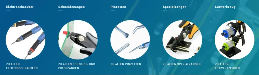 Our Toolshop provides you with hand tools like Cutters, Shears, Forming tools, Cut and Press pliers, Tweezers as well as Electric Screwdrivers including control units. Equip your staff with the right tools and increase your staff´s satisfaction!